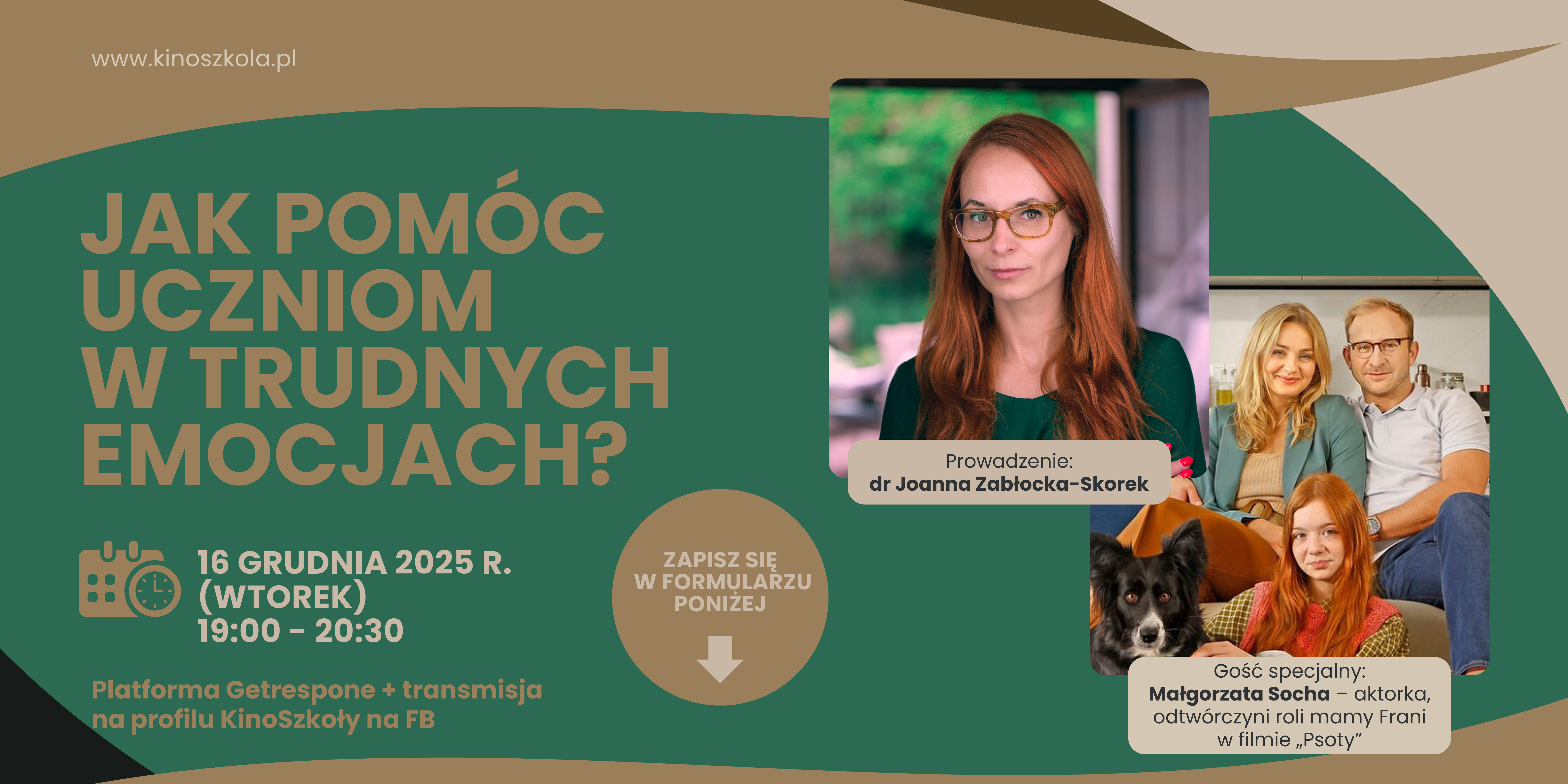 Miejsce: Platforma webinarowa GetResponse (max. 300 miejsc) + transmisja na profilu facebookowym KinoSzkoła oraz w grupie KinoSzkoła Klub Nauczycieli na Facebooku.